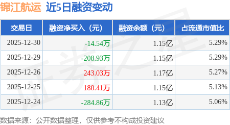 证券之星消息,12月30日,锦江航运(601083)融资买入538.79万元,融资偿还553.33万元,融资净卖出14.54万元,融资余额1.15亿元。