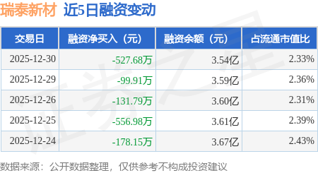 证券之星消息,12月30日,瑞泰新材(301238)融资买入2419.72万元,融资偿还2947.41万元,融资净卖出527.68万元,融资余额3.54亿元。