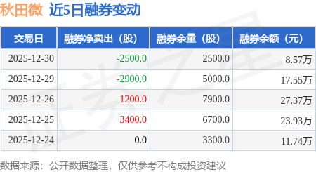 证券之星消息,12月30日,秋田微(300939)融资买入942.65万元,融资偿还1571.22万元,融资净卖出628.57万元,融资余额1.38亿元。