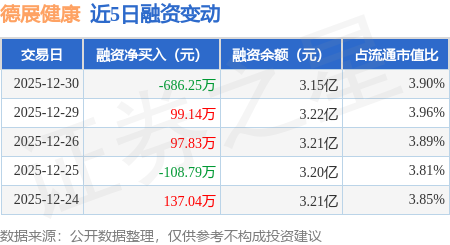 证券之星消息,12月30日,德展健康(000813)融资买入543.37万元,融资偿还1229.62万元,融资净卖出686.25万元,融资余额3.15亿元。