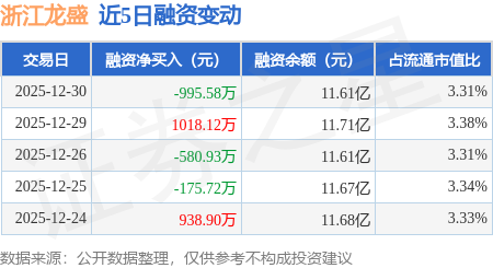 证券之星消息,12月30日,浙江龙盛(600352)融资买入1031.76万元,融资偿还2027.34万元,融资净卖出995.58万元,融资余额11.61亿元。