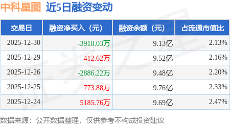 证券之星消息,12月30日,中科星图(688568)融资买入2.13亿元,融资偿还2.52亿元,融资净卖出3918.03万元,融资余额9.13亿元,近20个交易日中有11个交易日出现融资净买入。