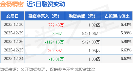 证券之星消息,12月30日,金杨精密(301210)融资买入1331.57万元,融资偿还559.15万元,融资净买入772.43万元,融资余额1.02亿元。