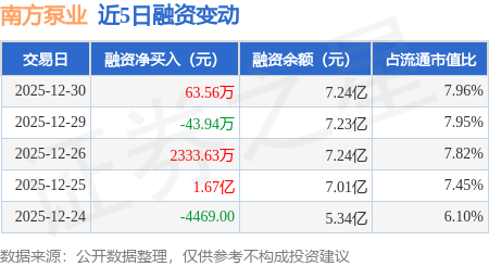 证券之星消息,12月30日,南方泵业(300145)融资买入6519.83万元,融资偿还6456.28万元,融资净买入63.56万元,融资余额7.24亿元。