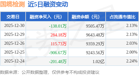 证券之星消息,12月30日,国缆检测(301289)融资买入626.95万元,融资偿还764.96万元,融资净卖出138.01万元,融资余额9505.47万元。