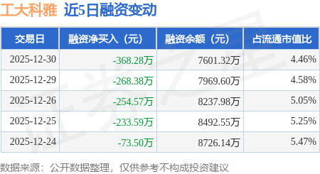 证券之星消息,12月30日,工大科雅(301197)融资买入485.47万元,融资偿还853.76万元,融资净卖出368.28万元,融资余额7601.32万元。