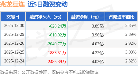 证券之星消息,12月30日,兆龙互连(300913)融资买入3099.54万元,融资偿还3727.78万元,融资净卖出628.24万元,融资余额3.89亿元。