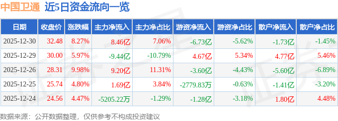 12月30日的资金流向数据方面,主力资金净流入8.46亿元,占总成交额7.06%,游资资金净流出6.73亿元,占总成交额5.62%,散户资金净流出1.73亿元,占总成交额1.45%。