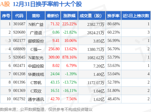 当日A股换手率前10大个股中6只个股收涨,平均涨幅190.23%,其中N新广益(301687)以换手率80.68%排第一,6只个股近5个交易日中多次上榜。