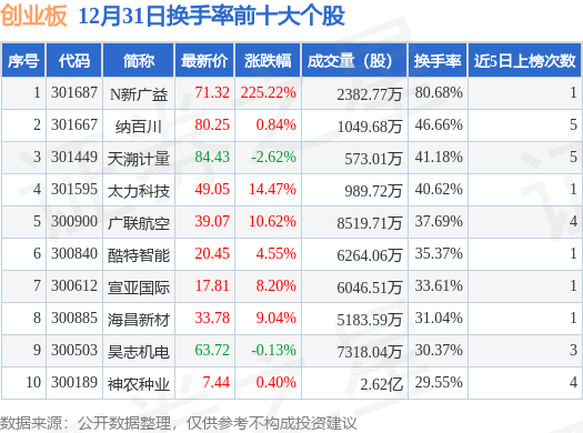 当日创业板换手率前10大个股中8只个股收涨,平均涨幅34.17%,其中N新广益(301687)以换手率80.68%排第一,5只个股近5个交易日中多次上榜。