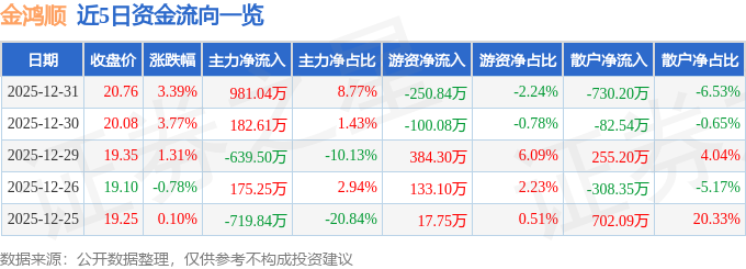 证券之星消息,截至2025年12月31日收盘,金鸿顺(603922)报收于20.76元,上涨3.39%,换手率3.05%,成交量5.47万手,成交额1.12亿元。