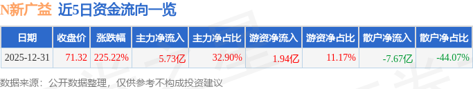 证券之星消息,截至2025年12月31日收盘,N新广益(301687)报收于71.32元,上涨225.22%,换手率80.68%,成交量23.83万手,成交额17.41亿元。