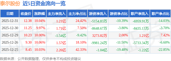 证券之星消息,截至2025年12月31日收盘,泰尔股份(002347)报收于12.38元,上涨10.04%,已连续涨停5天,换手率8.22%,成交量40.55万手,成交额4.96亿元。