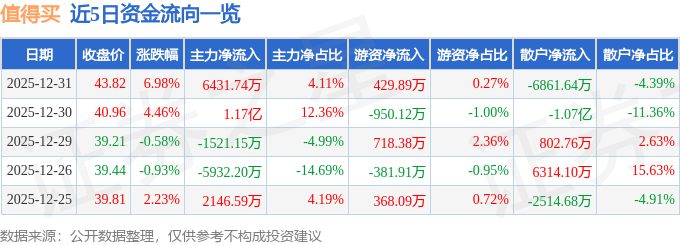 证券之星消息,截至2025年12月31日收盘,值得买(300785)报收于43.82元,上涨6.98%,换手率29.51%,成交量36.1万手,成交额15.64亿元。