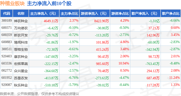 从资金流向上来看,当日种植业板块主力资金净流出2.02亿元,游资资金净流入1.55亿元,散户资金净流入4715.91万元。种植业板块个股资金流向见下表: