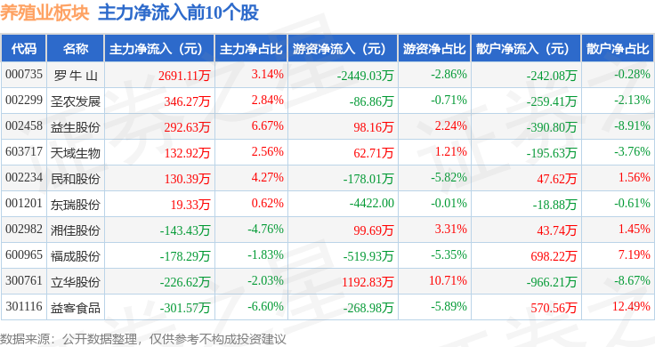 从资金流向上来看,当日养殖业板块主力资金净流出4.17亿元,游资资金净流入1.33亿元,散户资金净流入2.84亿元。养殖业板块个股资金流向见下表: