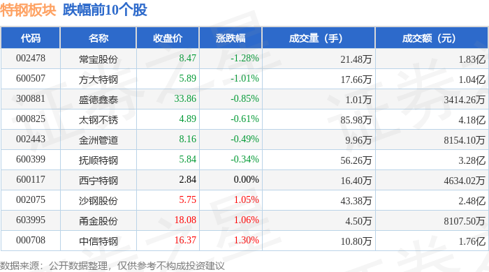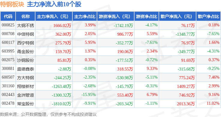从资金流向上来看,当日特钢板块主力资金净流出7709.52万元,游资资金净流入826.44万元,散户资金净流入6883.09万元。特钢板块个股资金流向见下表: