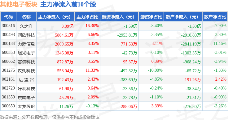 从资金流向上来看,当日其他电子板块主力资金净流出9.56亿元,游资资金净流出1.08亿元,散户资金净流入10.64亿元。其他电子板块个股资金流向见下表: