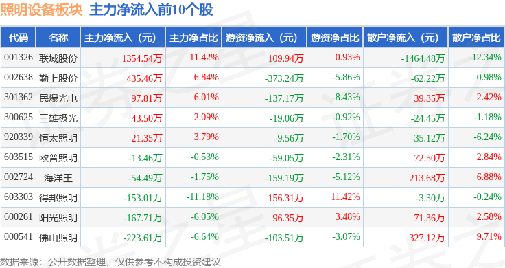 从资金流向上来看,当日照明设备板块主力资金净流出1644.25万元,游资资金净流出2036.91万元,散户资金净流入3681.16万元。照明设备板块个股资金流向见下表: