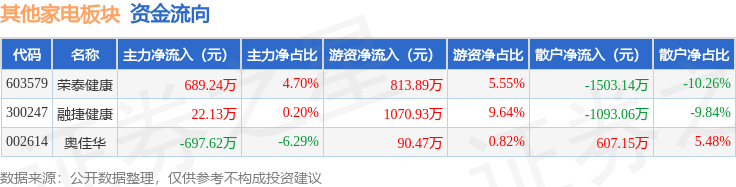 从资金流向上来看,当日其他家电板块主力资金净流入13.75万元,游资资金净流入1975.29万元,散户资金净流出1989.04万元。其他家电板块个股资金流向见下表: