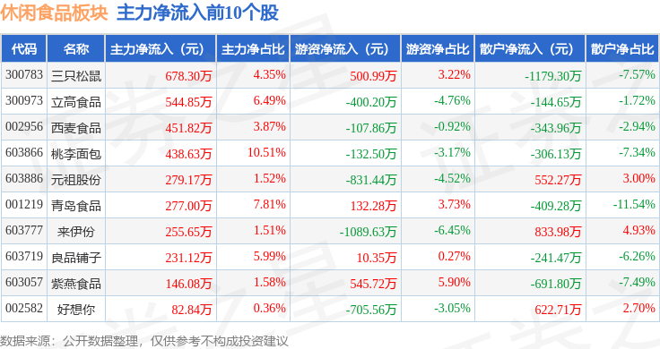 从资金流向上来看,当日休闲食品板块主力资金净流出857.81万元,游资资金净流出3275.83万元,散户资金净流入4133.64万元。休闲食品板块个股资金流向见下表: