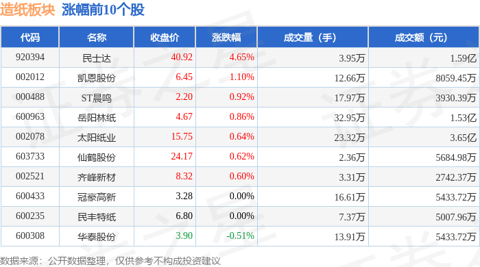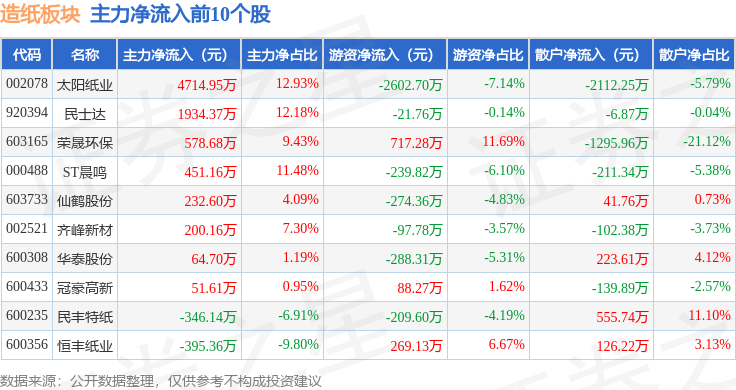 从资金流向上来看,当日造纸板块主力资金净流出3.71亿元,游资资金净流入195.11万元,散户资金净流入3.69亿元。造纸板块个股资金流向见下表: