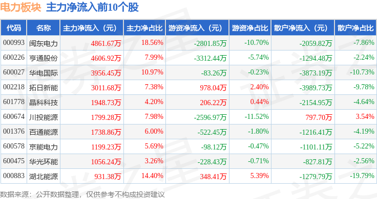 从资金流向上来看,当日电力板块主力资金净流出10.47亿元,游资资金净流入3.6亿元,散户资金净流入6.87亿元。电力板块个股资金流向见下表: