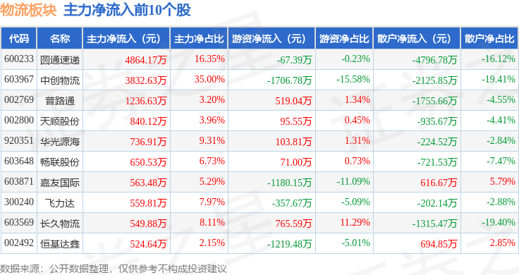 从资金流向上来看,当日物流板块主力资金净流出3.5亿元,游资资金净流入1827.88万元,散户资金净流入3.31亿元。物流板块个股资金流向见下表: