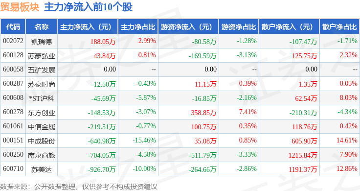从资金流向上来看,当日贸易板块主力资金净流出8048.52万元,游资资金净流出722.41万元,散户资金净流入8770.93万元。贸易板块个股资金流向见下表: