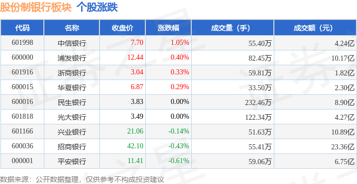 证券之星消息,12月31日股份制银行板块较上一交易日下跌0.01%,平安银行领跌。当日上证指数报收于3968.84,上涨0.09%。深证成指报收于13525.02,下跌0.58%。股份制银行板块个股涨跌见下表: