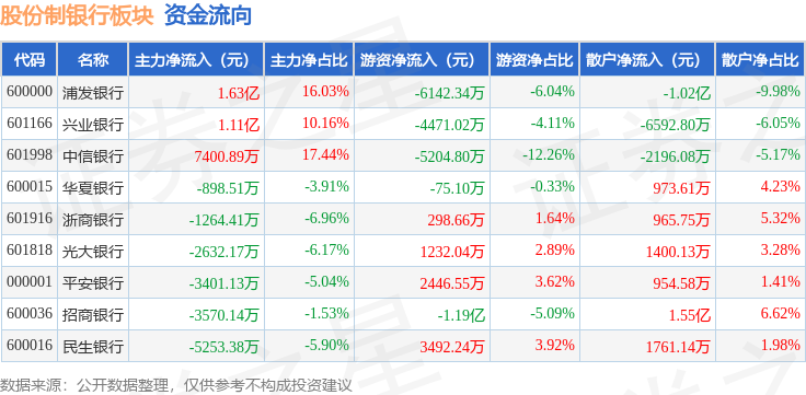 从资金流向上来看,当日股份制银行板块主力资金净流入1.77亿元,游资资金净流出2.03亿元,散户资金净流入2568.23万元。股份制银行板块个股资金流向见下表: