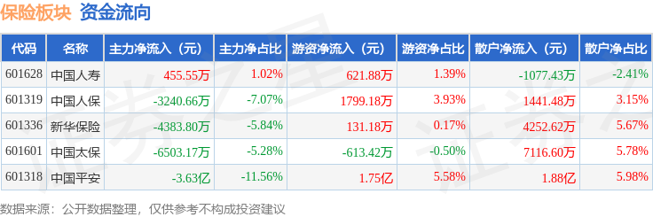 从资金流向上来看,当日保险板块主力资金净流出5.0亿元,游资资金净流入1.95亿元,散户资金净流入3.05亿元。保险板块个股资金流向见下表:
