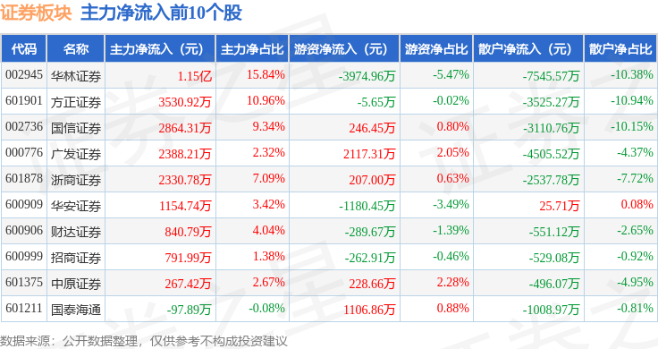 从资金流向上来看,当日证券板块主力资金净流出15.24亿元,游资资金净流入9.04亿元,散户资金净流入6.2亿元。证券板块个股资金流向见下表: