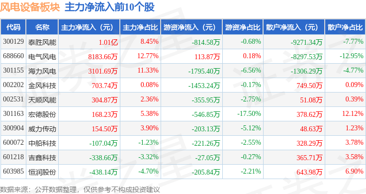 从资金流向上来看,当日风电设备板块主力资金净流出3.26亿元,游资资金净流出6454.45万元,散户资金净流入3.91亿元。风电设备板块个股资金流向见下表: