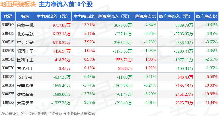 从资金流向上来看,当日地面兵装板块主力资金净流出9373.0万元,游资资金净流出8086.08万元,散户资金净流入1.75亿元。地面兵装板块个股资金流向见下表: