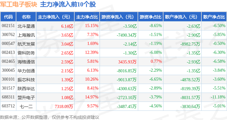 从资金流向上来看,当日军工电子板块主力资金净流入25.55亿元,游资资金净流出12.2亿元,散户资金净流出13.35亿元。军工电子板块个股资金流向见下表: