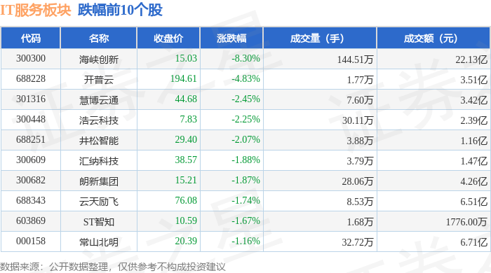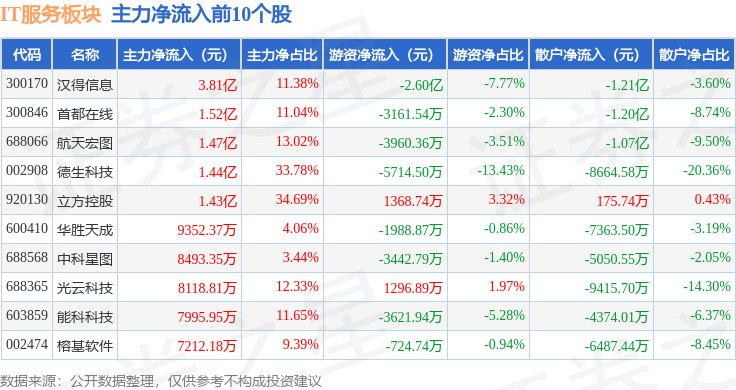 从资金流向上来看,当日IT服务板块主力资金净流入4.54亿元,游资资金净流出5.86亿元,散户资金净流入1.33亿元。IT服务板块个股资金流向见下表: