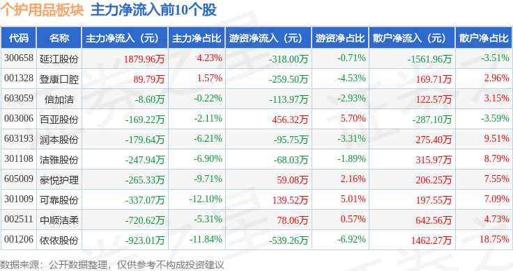 从资金流向上来看,当日个护用品板块主力资金净流出3167.45万元,游资资金净流入534.45万元,散户资金净流入2633.0万元。个护用品板块个股资金流向见下表: