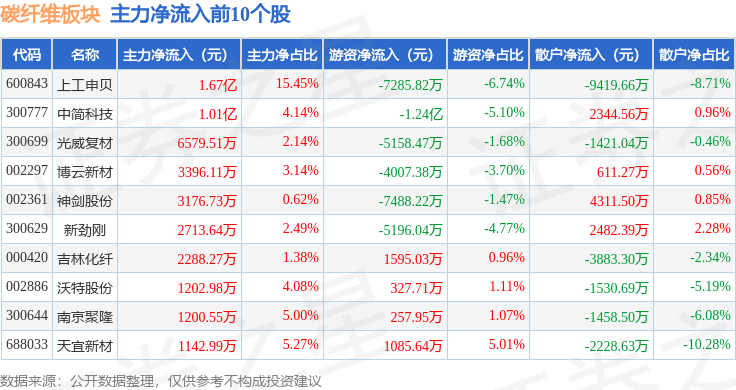 从资金流向上来看,当日碳纤维板块主力资金净流出5.93亿元,游资资金净流出2.05亿元,散户资金净流入7.98亿元。碳纤维板块个股资金流向见下表: