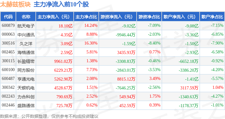 从资金流向上来看,当日太赫兹板块主力资金净流入27.51亿元,游资资金净流出11.11亿元,散户资金净流出16.4亿元。太赫兹板块个股资金流向见下表: