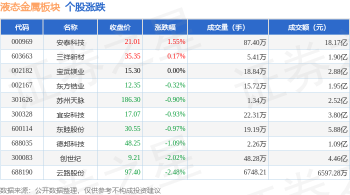 证券之星消息,12月31日液态金属板块较上一交易日下跌0.54%,云路股份领跌。当日上证指数报收于3968.84,上涨0.09%。深证成指报收于13525.02,下跌0.58%。液态金属板块个股涨跌见下表: