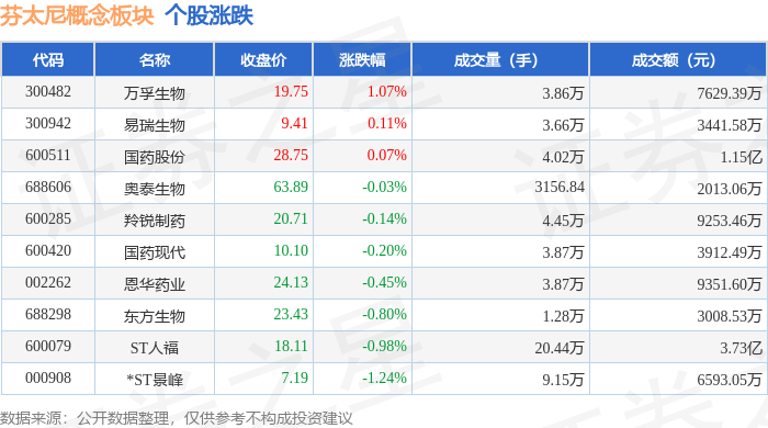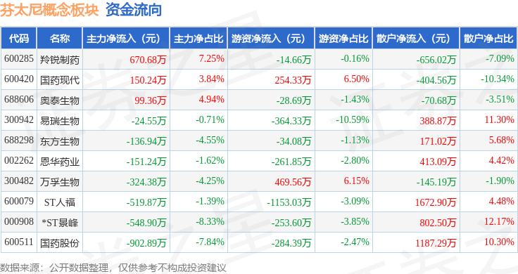 从资金流向上来看,当日芬太尼概念板块主力资金净流出1688.48万元,游资资金净流出1670.73万元,散户资金净流入3359.21万元。芬太尼概念板块个股资金流向见下表: