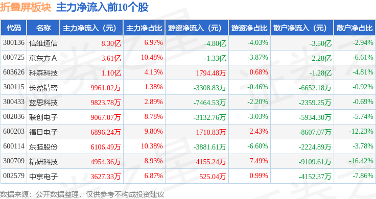 从资金流向上来看,当日折叠屏板块主力资金净流出9.68亿元,游资资金净流出2.06亿元,散户资金净流入11.74亿元。折叠屏板块个股资金流向见下表: