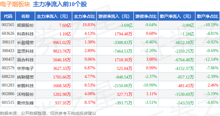 从资金流向上来看,当日电子烟板块主力资金净流出14.87亿元,游资资金净流入7278.11万元,散户资金净流入14.14亿元。电子烟板块个股资金流向见下表: