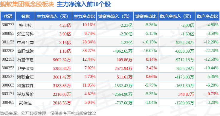 从资金流向上来看,当日蚂蚁集团概念股板块主力资金净流出1.28亿元,游资资金净流出6.04亿元,散户资金净流入7.32亿元。蚂蚁集团概念股板块个股资金流向见下表: