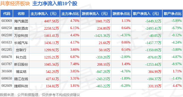 从资金流向上来看,当日共享经济板块主力资金净流出9.6亿元,游资资金净流入1.27亿元,散户资金净流入8.33亿元。共享经济板块个股资金流向见下表: