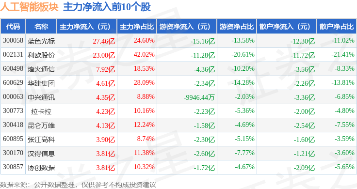 从资金流向上来看,当日人工智能板块主力资金净流入53.65亿元,游资资金净流出45.1亿元,散户资金净流出8.55亿元。人工智能板块个股资金流向见下表: