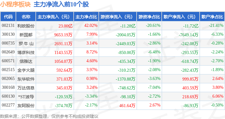 从资金流向上来看,当日小程序板块主力资金净流入23.84亿元,游资资金净流出12.01亿元,散户资金净流出11.83亿元。小程序板块个股资金流向见下表: