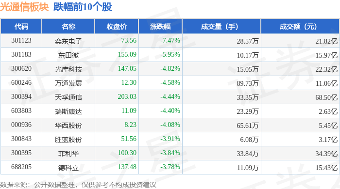 从资金流向上来看,当日光通信板块主力资金净流出65.0亿元,游资资金净流入16.31亿元,散户资金净流入48.69亿元。光通信板块个股资金流向见下表: