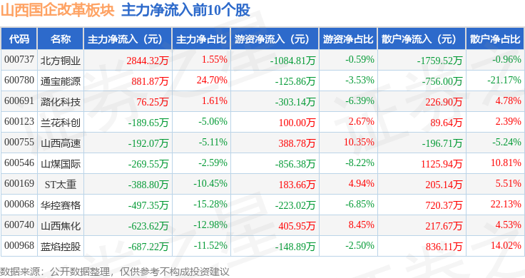 从资金流向上来看,当日山西国企改革板块主力资金净流出1.72亿元,游资资金净流入2661.26万元,散户资金净流入1.45亿元。山西国企改革板块个股资金流向见下表: